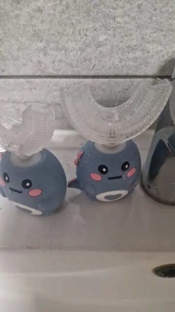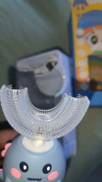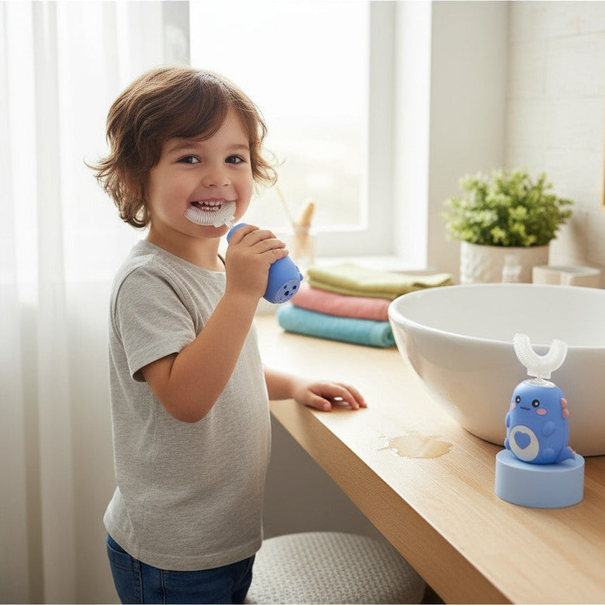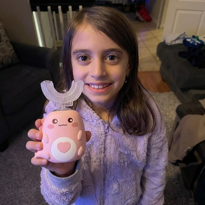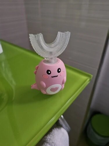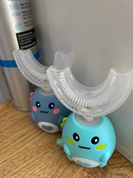 It truly cleans. The U-shaped silicone bristles surround the teeth to clean all surfaces at once—front, back, and chewing areas—while gentle sonic vibrations help loosen and remove plaque. It’s designed for full coverage, not just a vibrating feel. Many parents notice cleaner teeth at their child’s dental checkups after making the switch.