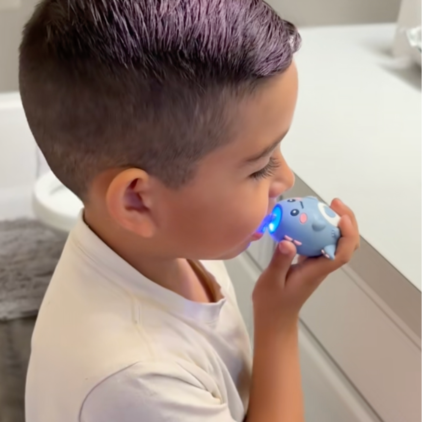 The mouthpiece is intentionally sized to prevent swallowing, and the handle is easy for small hands—or parents—to hold. The food-grade, BPA-free silicone is gentle on sensitive gums. As with any toothbrush, adult supervision is recommended for children under 3.